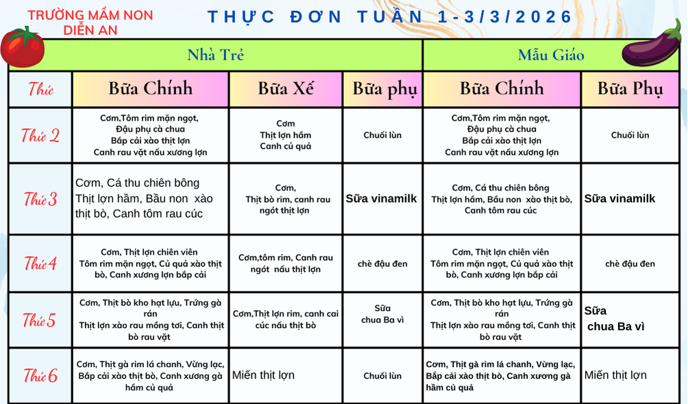 CÔNG KHAI THỰC ĐƠN TUẦN 2,4 THÁNG 3 NĂM 2026