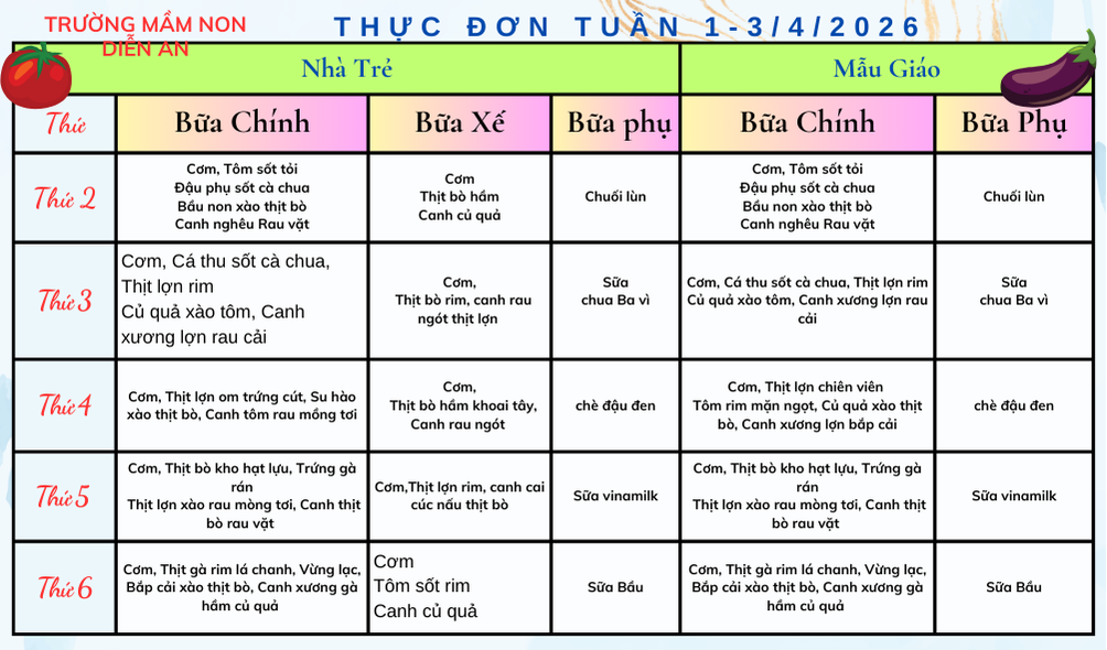 CÔNG KHAI THỰC ĐƠN TUẦN 2,4 THÁNG 3 NĂM 2026